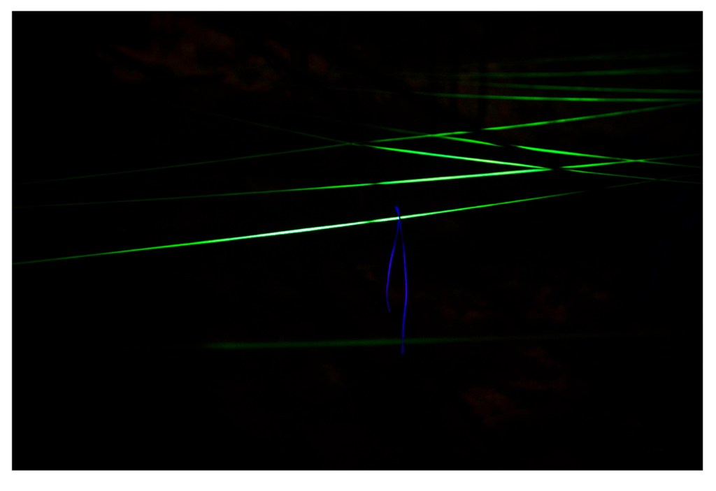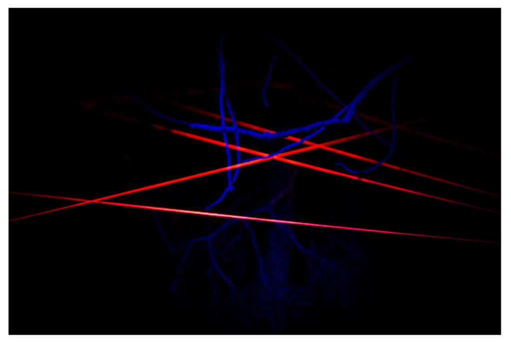 The Crossed Cultures series developed as a response to the unexpectedly rich variety of fungi we encountered upon arriving in the forest of the Grand Canyon’s North Rim. The fruiting body’s brief appearance prompted contemplation on the vast invisible networks of mycelium so instrumental in contributing to an ecosystem’s well being. The English mycologist Alan Rayner regards them as ‘troops, variously equipped for different roles and in varying degrees of communication with one another. Without a commander, other than the dictates of their environmental circumstances, these troops organise themselves into a beautifully open-ended or indeterminate dynamic structure that can continually respond to changing demands’. (Alan DM Rayner, ’Conflicting flows: the dynamics of mycelial territoriality’, McIlvainea 10 (1991) 24-35) In an attempt to ‘bring to light’ those hidden systems, I used what I had at hand – builder’s string and a black light.
