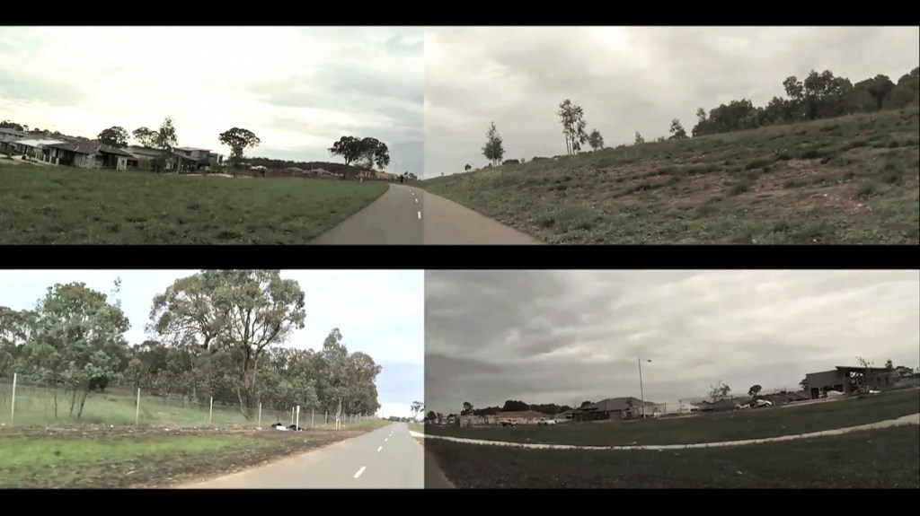 The Bitumen Divide is an observational video work taken whilst circumnavigating Canberra’s newly hatched suburb of Crace by bicycle one mid-week morning in April. Cycling had become my chosen form of transport since moving to Australia’s capital, affording me to actively engage with and observe my physical surroundings as I traverse the spacious and undulating territory.