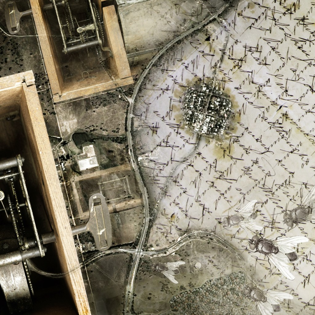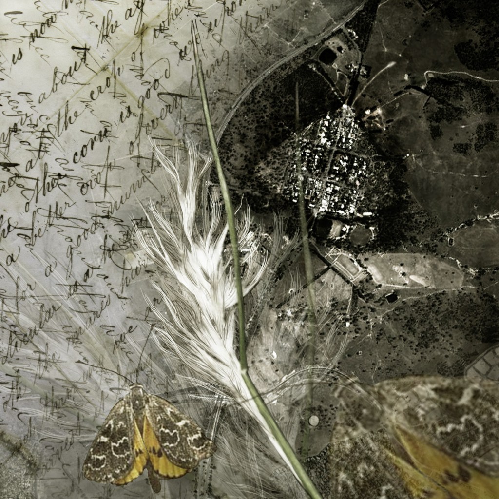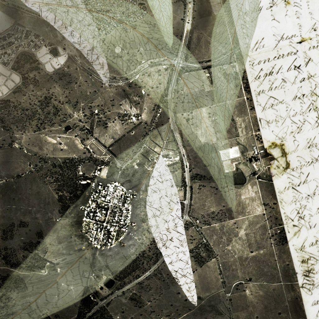 The background layer for each of the four elements in Frame of Reference is formed by an image of Hall, a small village later absorbed by Australia’s capital taken from space – nestled amongst its surrounding hills and in proximity of the encroaching suburban developments. Like a compass, each image points at one of the cardinal directions. An aerial view of Hall’s distinct and contained layout suggests to me the shape of an insect nestled on a leaf, an outline the bypassing highway forms, prompting reflections on the interrelationships between the small and often overlooked elements within complex systems. The historic and rural qualities of Hall are an important asset to the nearby capital and in return, the urban proximity assures Hall’s prosperity. Like insects in their myriad of forms, their role in the well-being of the biosphere they inhabit is indicative of and influences systemic changes. Discovering recurring patterns, visually and conceptually, informs my working processes as an artist and contributed to the layers within this work. The objects I photographed from the Hall Museum collection were chosen for their intrigue. The narratives and nostalgic values they hold are intrinsic to the enthusiasm motivating the collection and appreciation of such objects. Materials chosen to reflect those qualities frame this work.